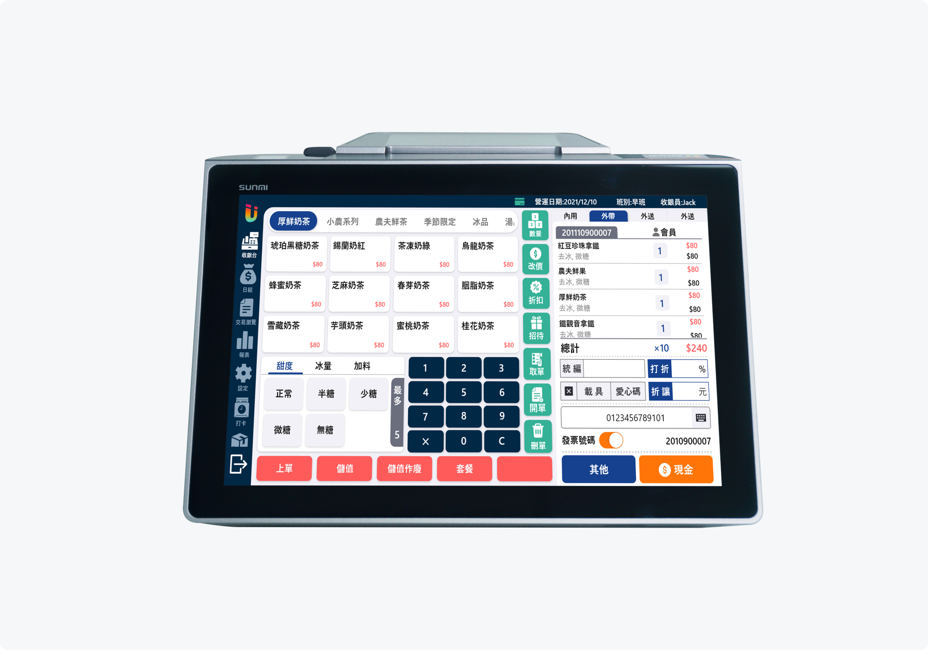 員工只要選品項、輸會員,系統自動計算服務費、套用促銷、並開立發票,節省找功能或切換畫面的時間。